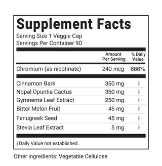 Specially formulated by experts, this potent blend is high in chromium and natural herbs for holistic glucose health. Includes cinnamon bark, nopal Opuntia Cactus, Gymnema Sylvestre Leaf and more.
